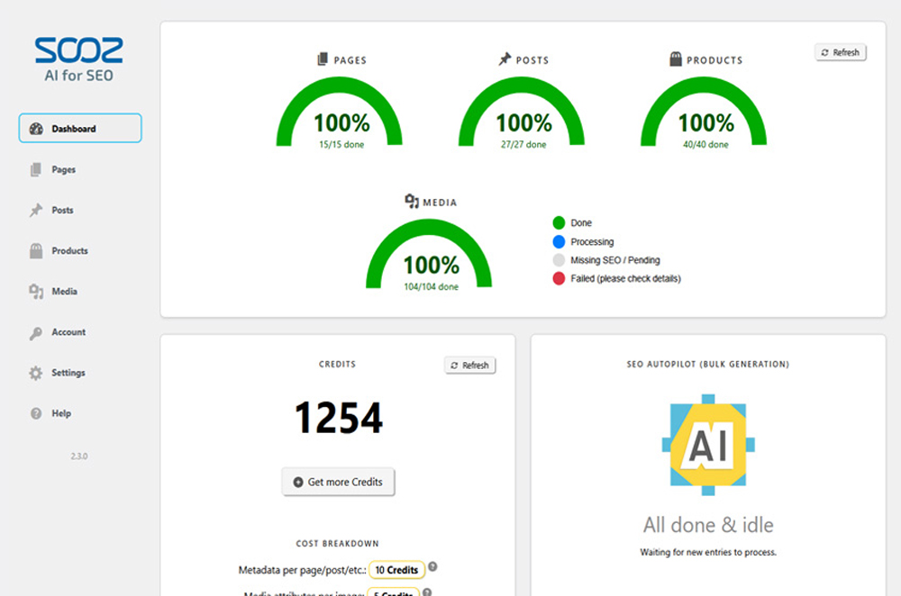 Credits are used when SOOZ – AI for SEO generates metadata for your content (posts, pages, products, media files etc.). The amount of Credits required depends on the selected active meta tags and media attributes (see Settings).