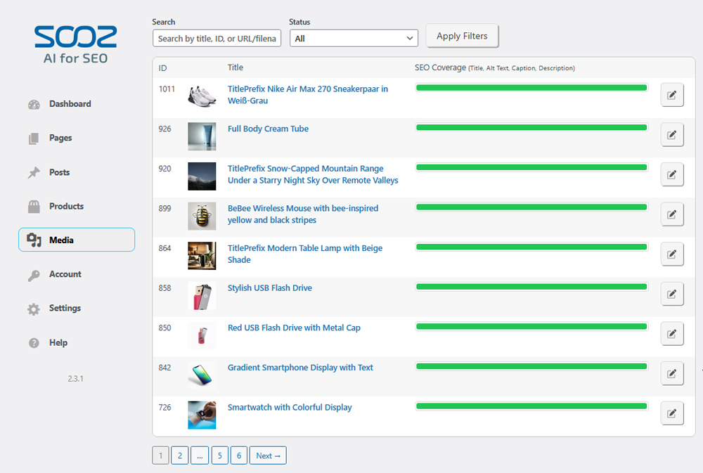 • You can use the bulk or manual generation options available. Simply click the ‘Generate with SOOZ’ button in the media library or explore the new ‘Media’ page within the SOOZ – AI for SEO plugin.