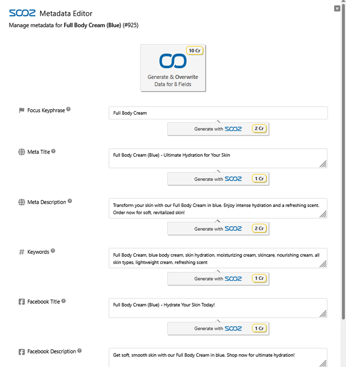 We add ‘Generate with SOOZ’ buttons in these editors so you can create SEO titles, descriptions, and image attributes in one click. It’s like having an SEO Copilot inside each editor.