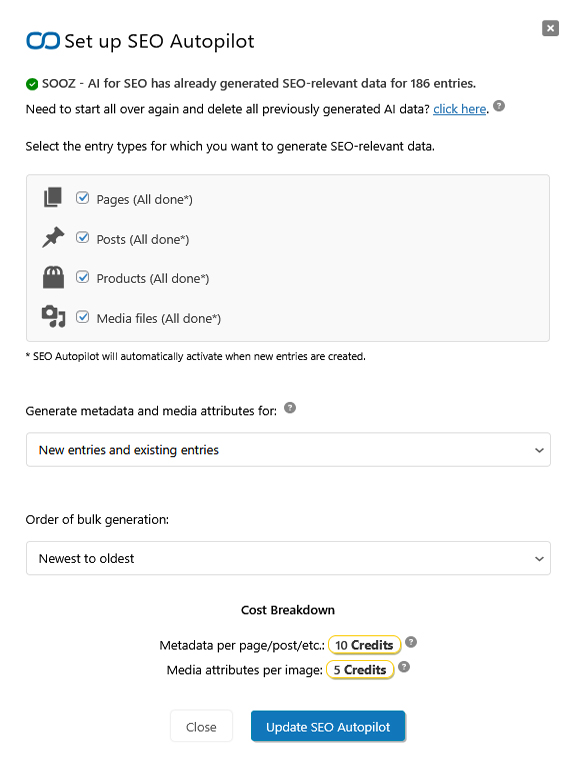 • Added a reminder and one-click removal option for previously generated SEO-relevant data within the SEO Autopilot modal.