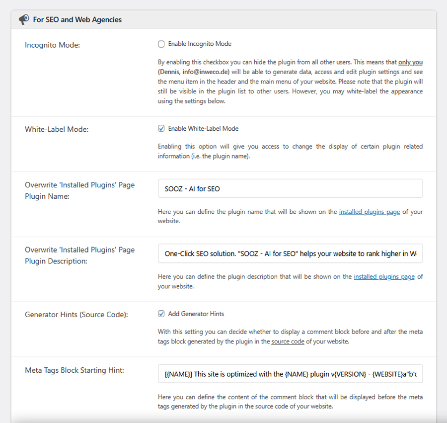 • Incognito Mode: SEO and web agencies can hide the plugin from other users/admins (available in the new “Account” page).