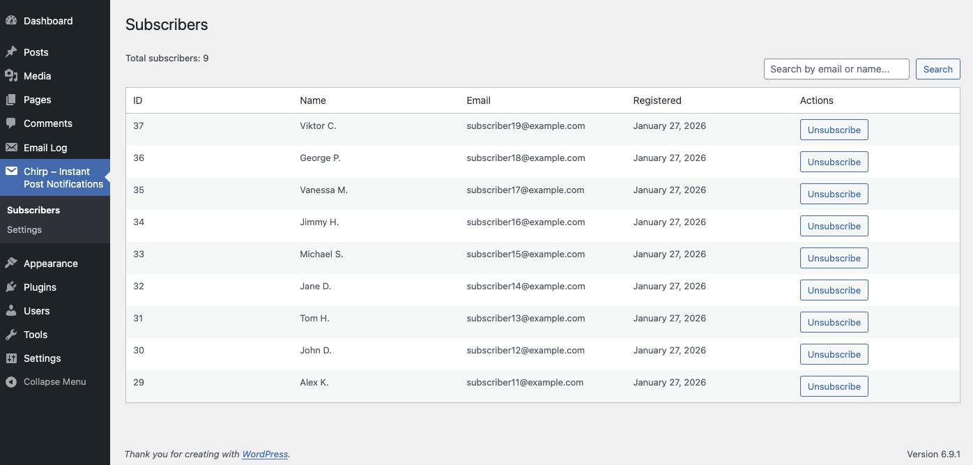 View and manage all subscribers from Chirp – Instant Post Notifications Subscribers in the WordPress admin. You can: