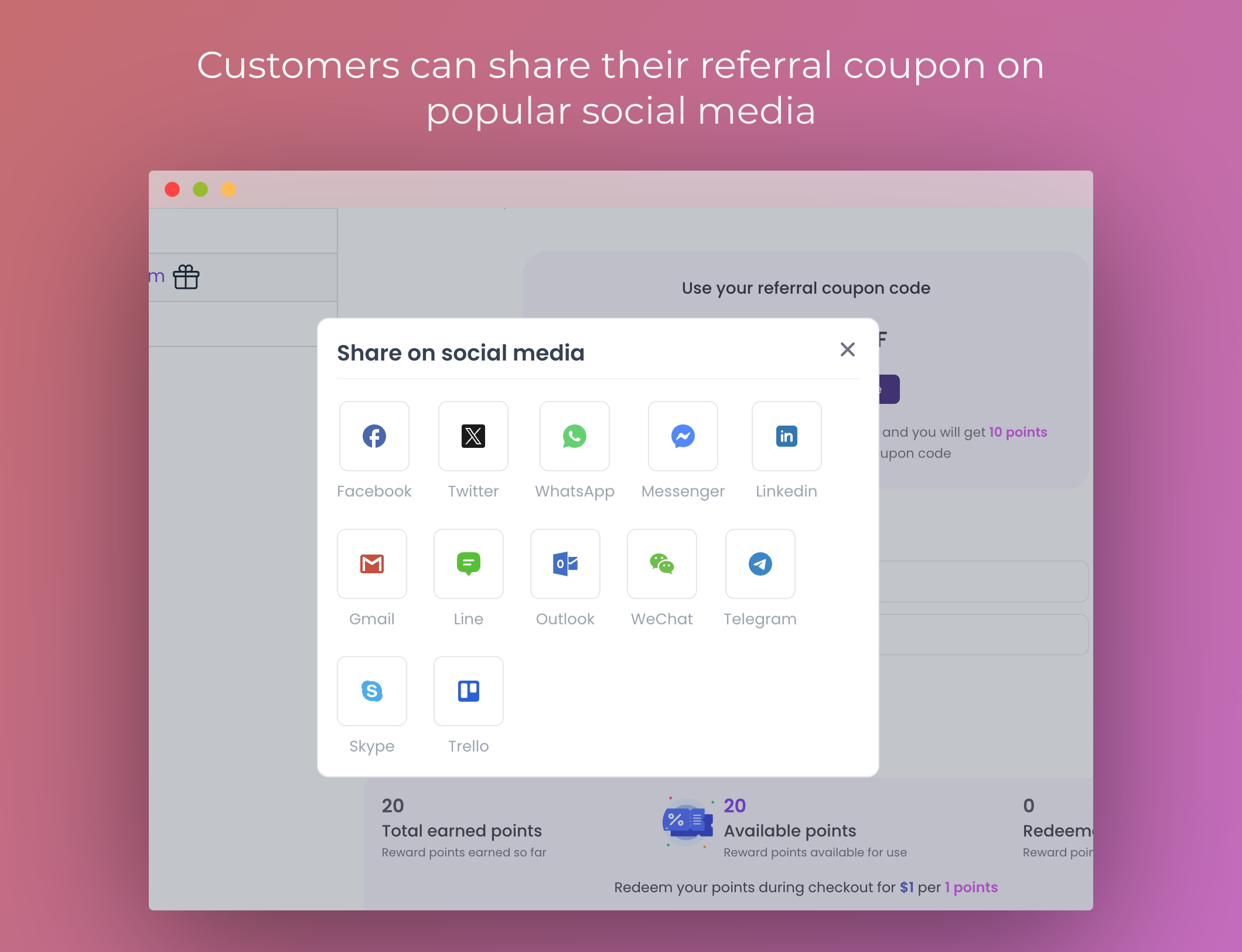 📱 Social Sharing: Share referral coupons through Facebook, X (Twitter), and WhatsApp.