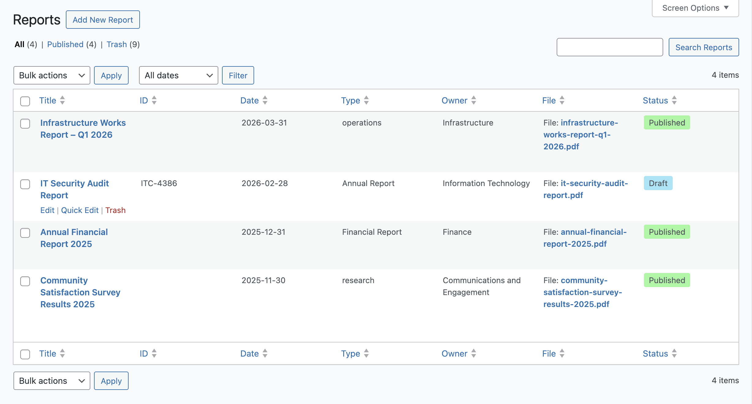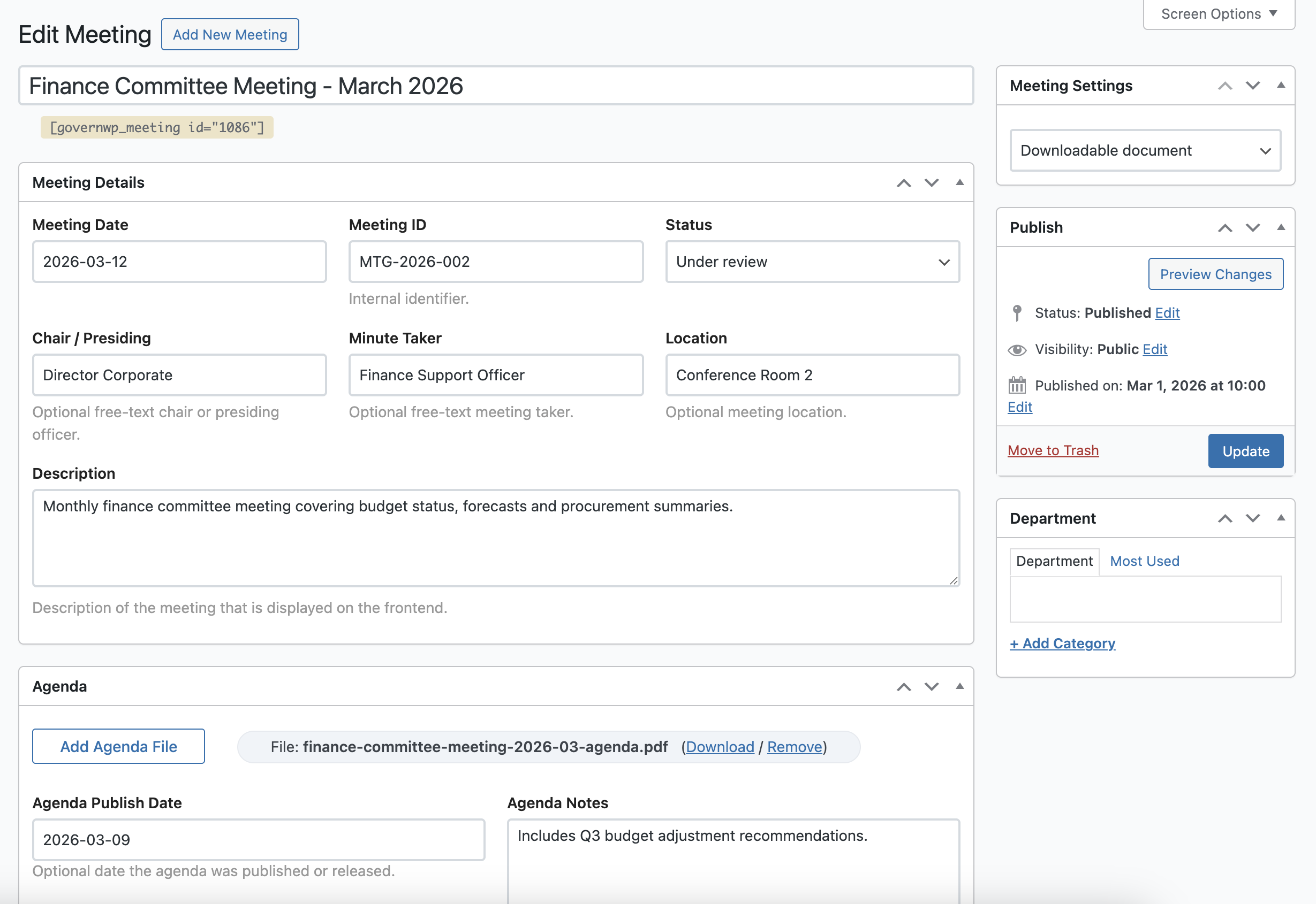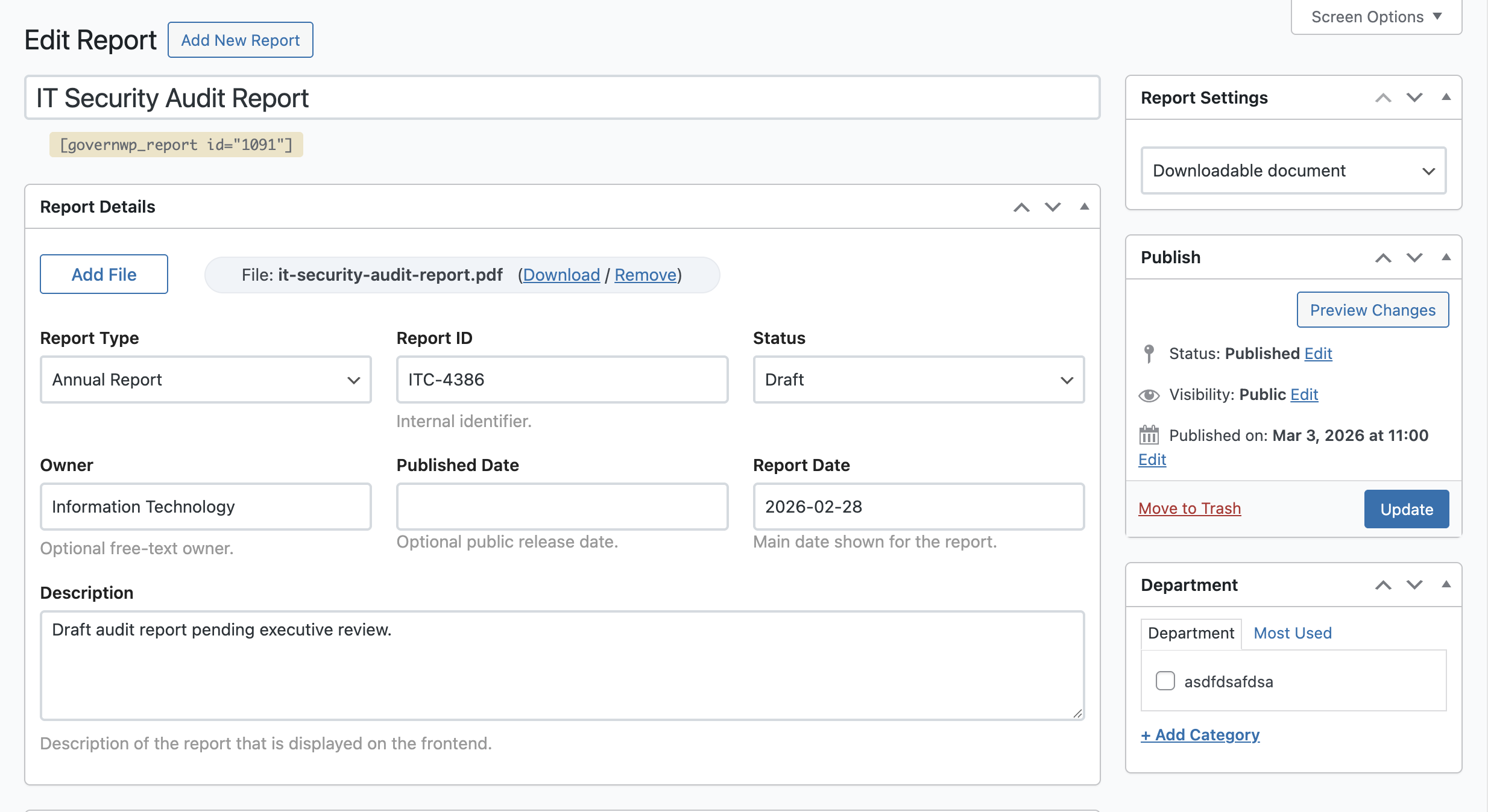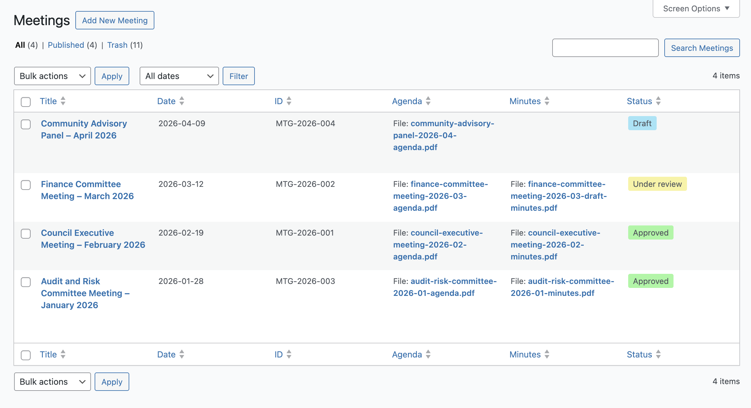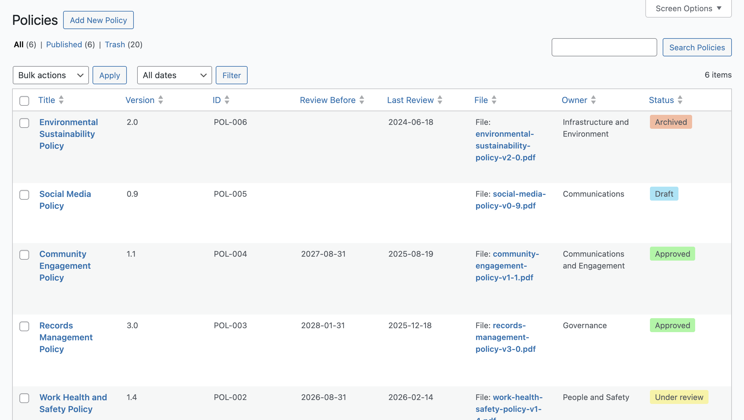 The plugin adds dedicated content types so these documents can be stored in a structured way, with fields for files, dates, versions, status information, and other governance-related details. You can then display them on your website using shortcodes.