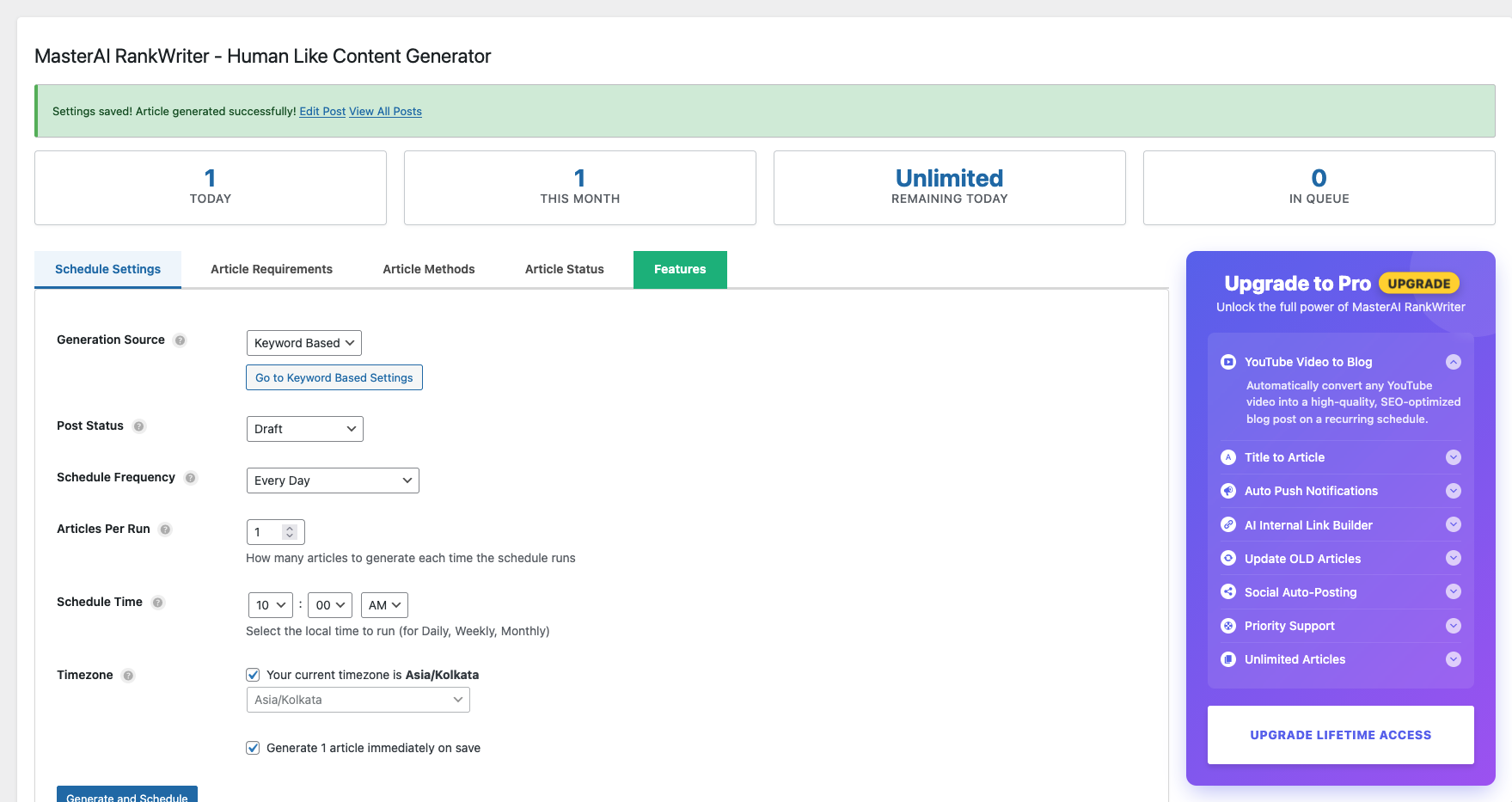 * Keyword Based Automation: Schedule-based article generation directly from your target keywords with flexible scheduling (daily, weekly, monthly, or custom intervals).