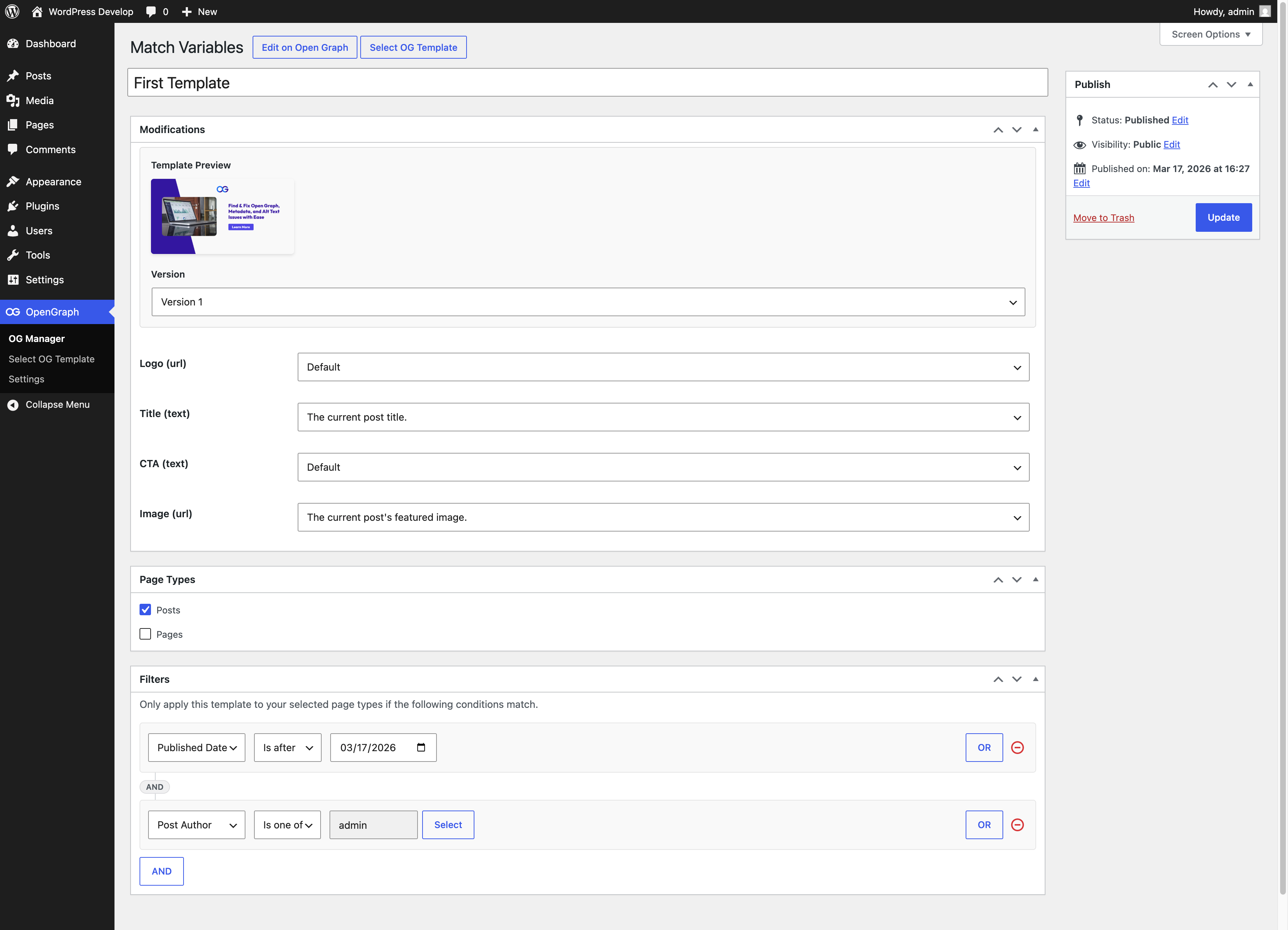 Once you’ve selected a template, the next step is to map the template’s dynamic variables to corresponding WordPress variables. For example, you can link a ‘title’ variable in your template to the ‘Post Title’ in WordPress. This ensures that the dynamic content from your site, like post titles or featured images, is automatically incorporated into your Open Graph images. You’ll find these settings in the template editing interface, where you can easily assign WordPress variables to your template’s dynamic elements.