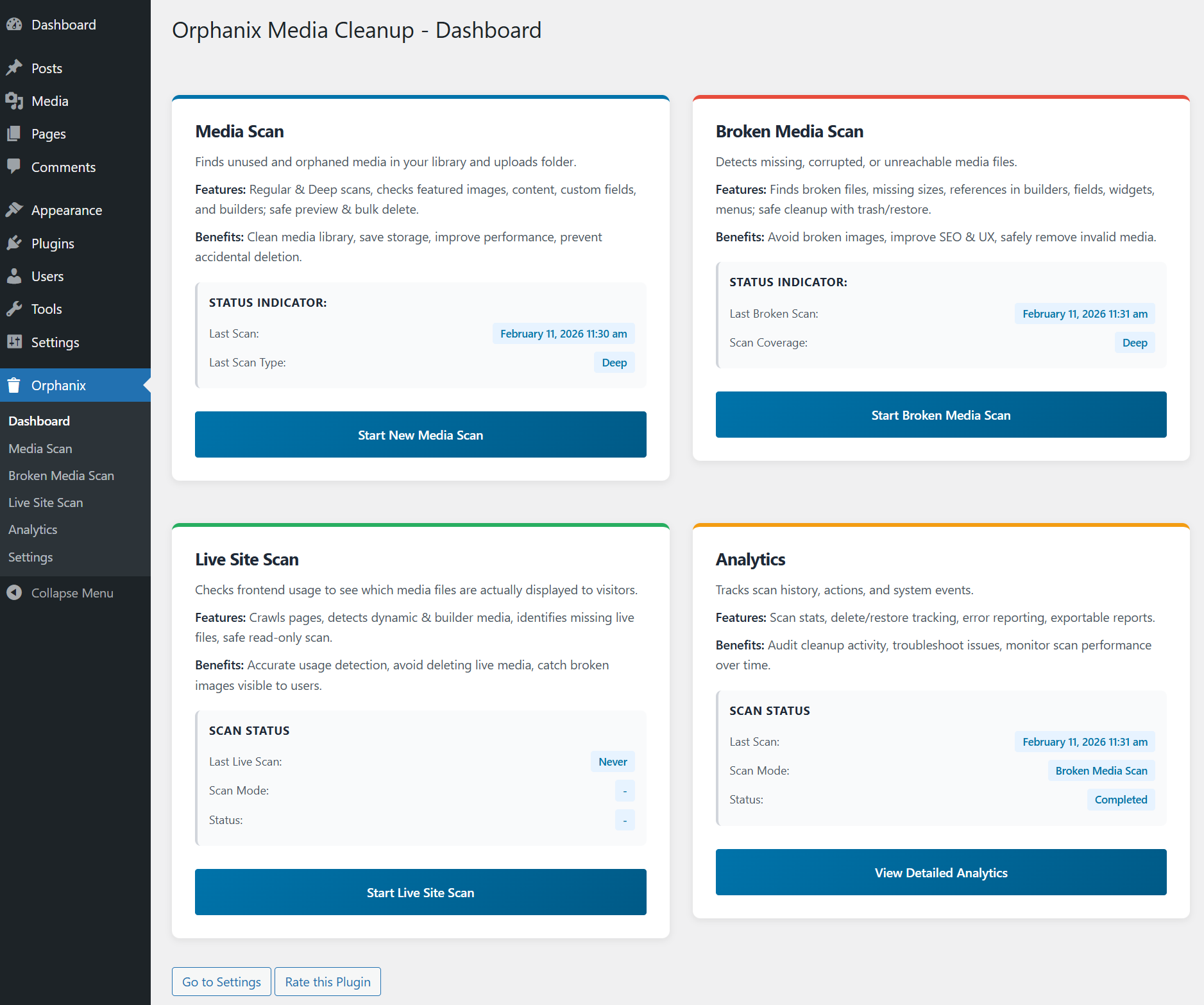 orphanix-media-cleanupfolder to/wp-content/plugins/ - Activate the plugin via the WordPress Plugins menu