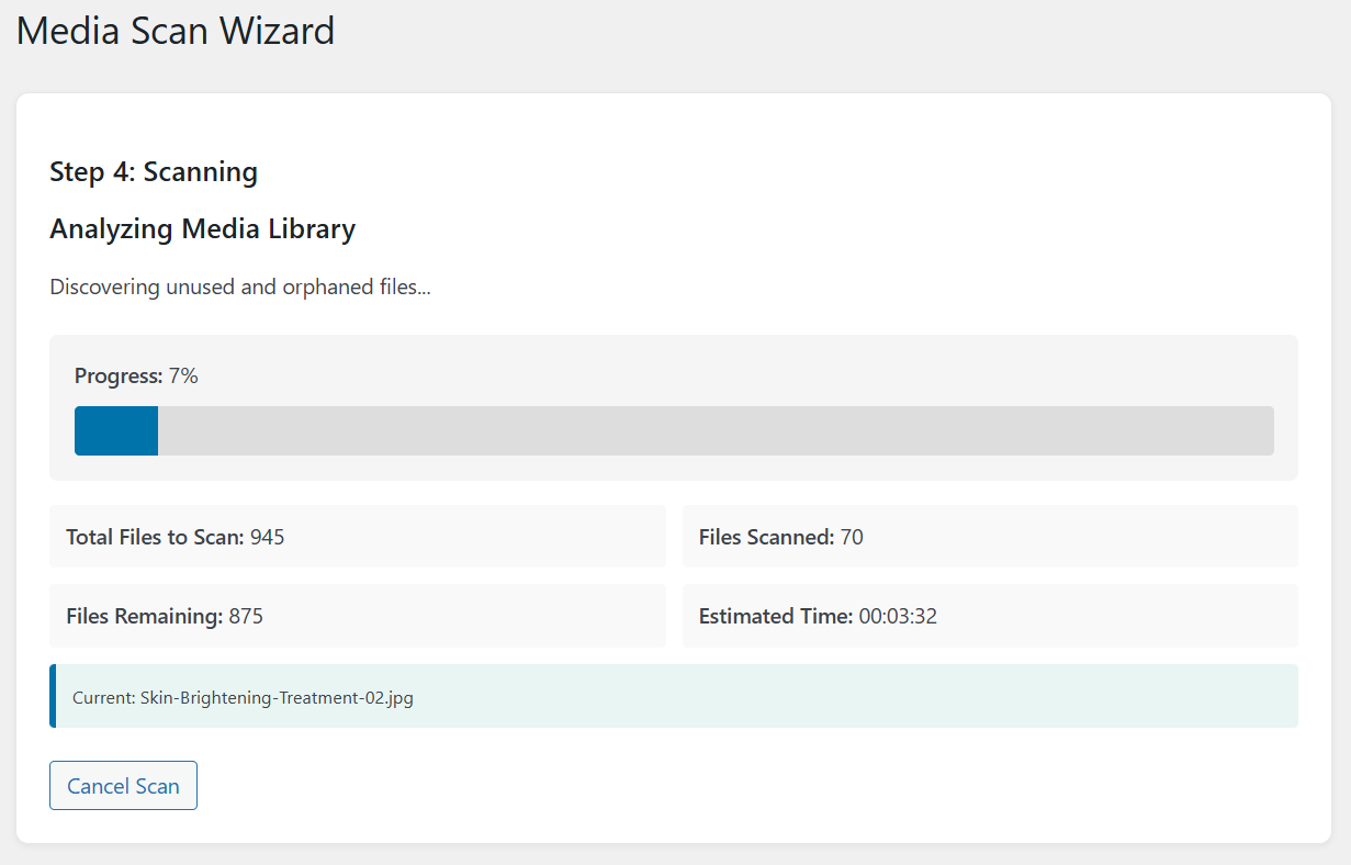 Media Scan Wizard – Step 4: Real-time scanning process with live progress indicators and background media analysis.