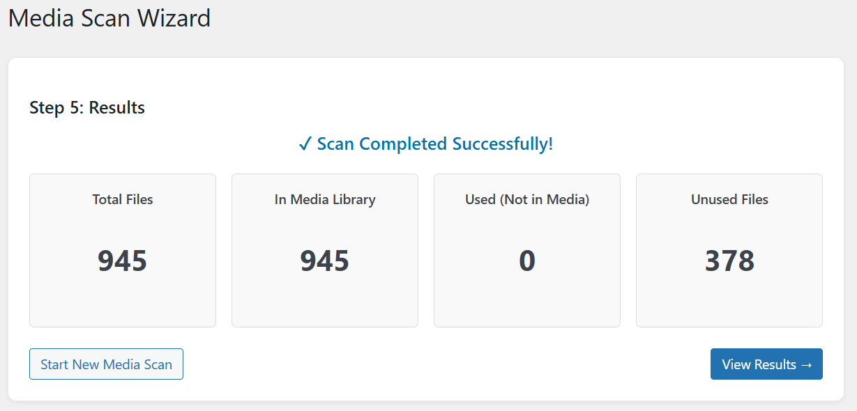 Media Scan Wizard – Step 5: Final scan results summary showing detected orphan files and unused media items.