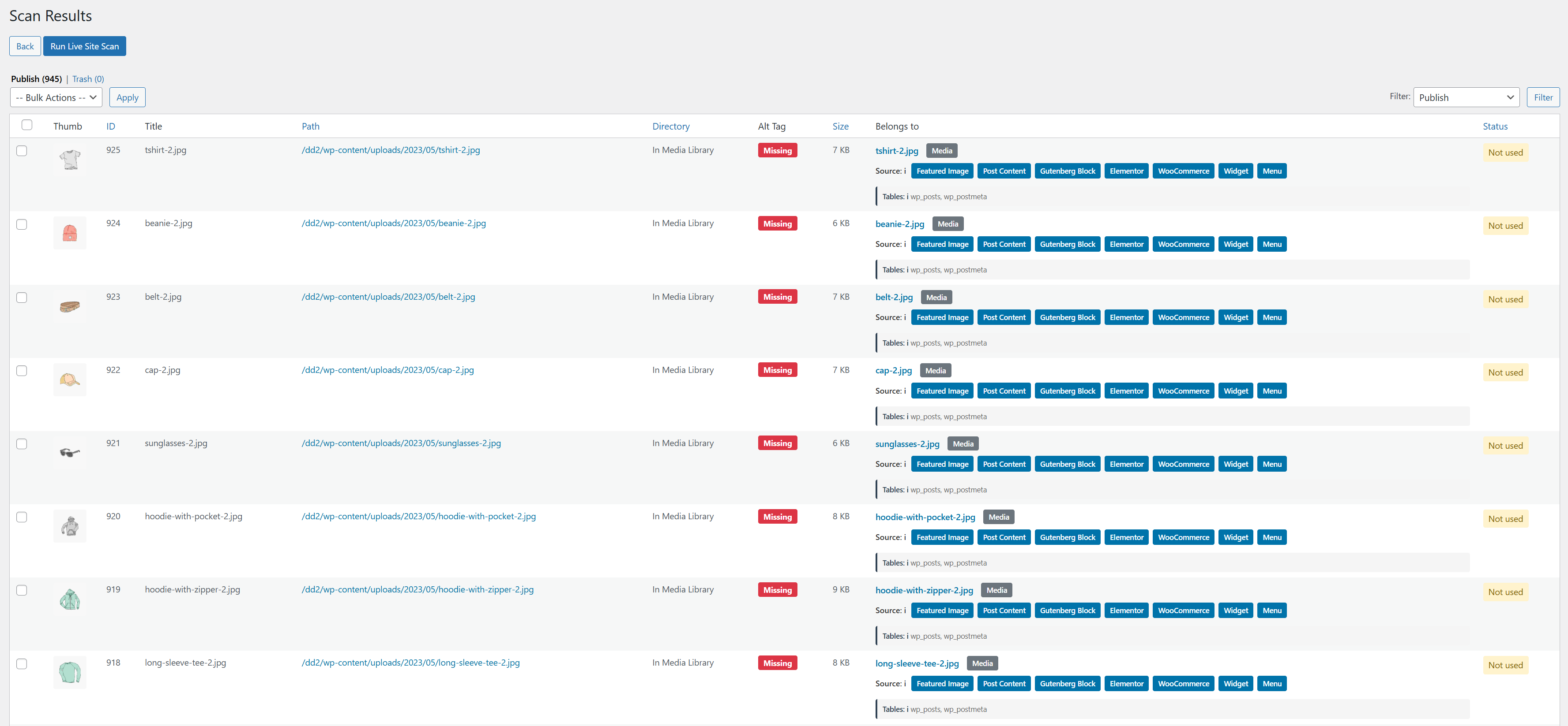 Detailed Scan Results – Complete list of unused media files with usage references and safe deletion options.