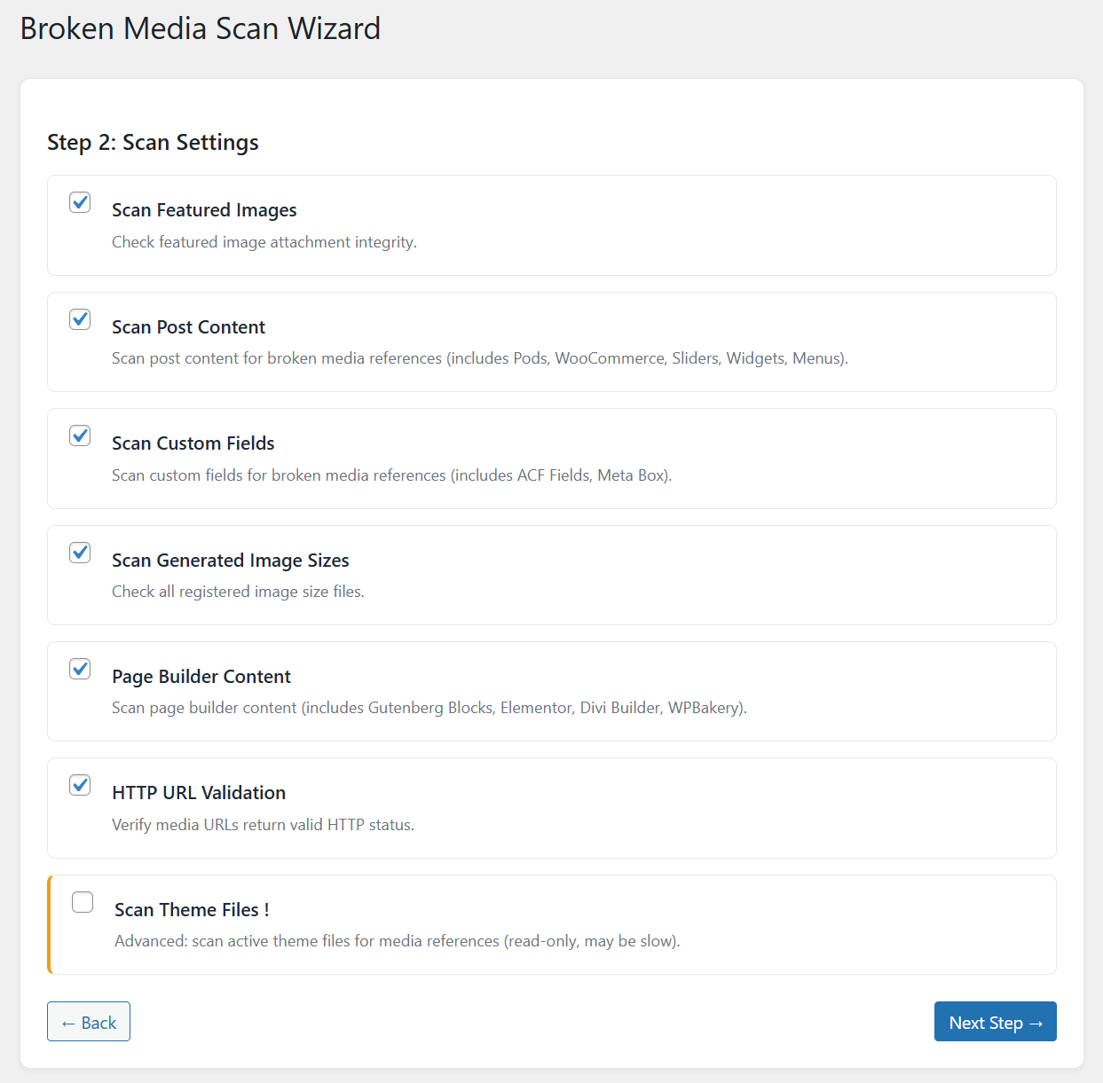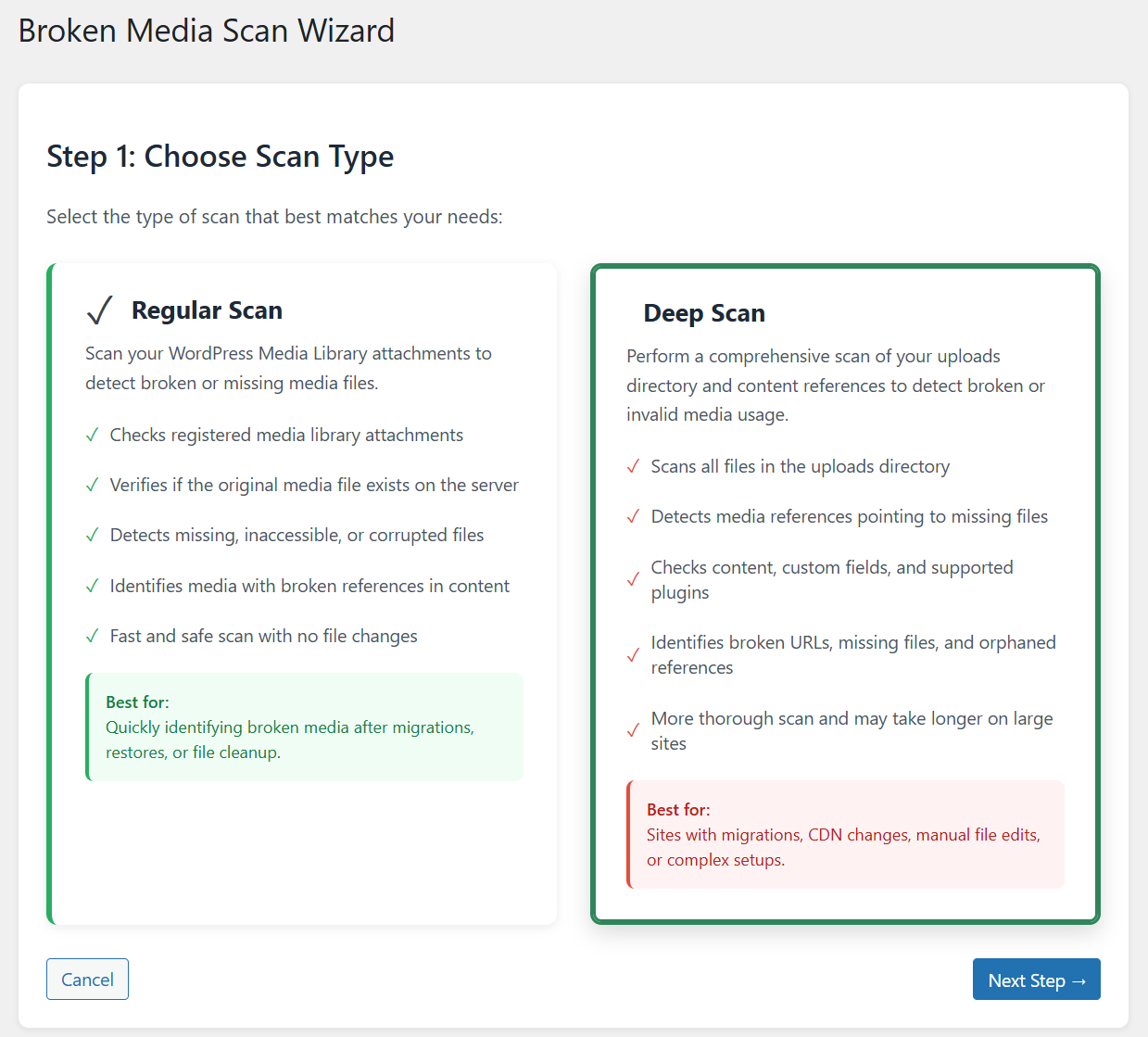 Broken Media Scan Wizard – Step 1: Select scan type to detect broken image links and missing attachments in WordPress.