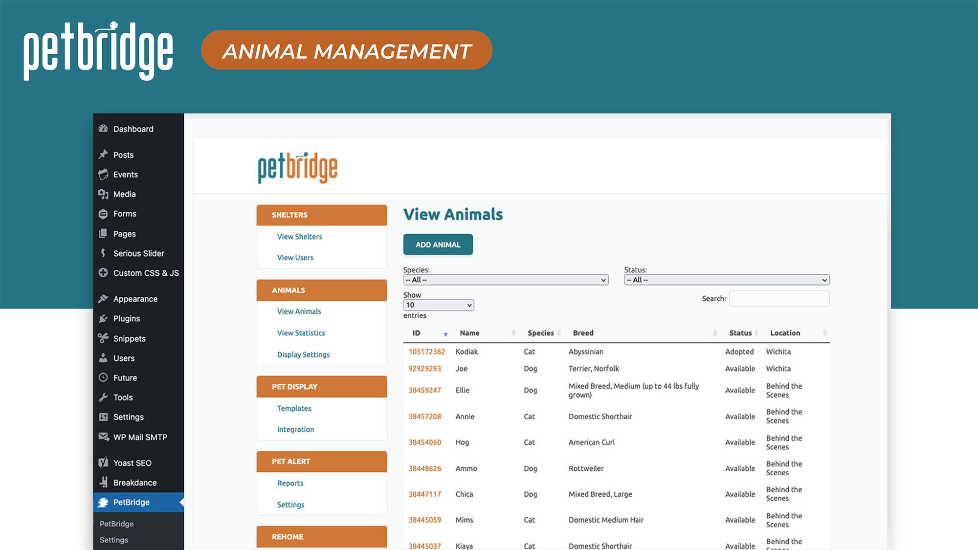 PetBridge is a WordPress plugin designed for animal shelters and rescues to display adoptable pets directly on their website.