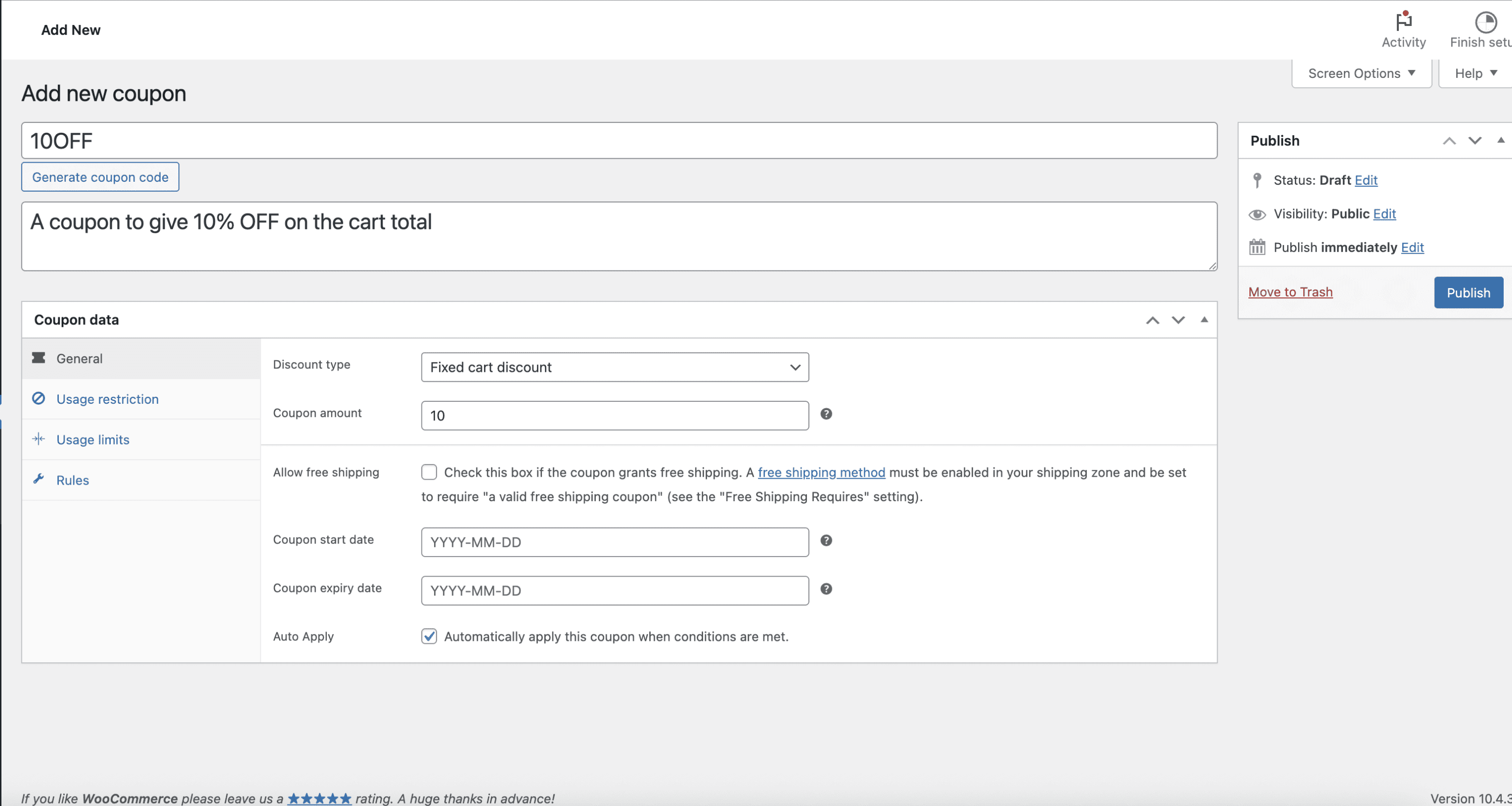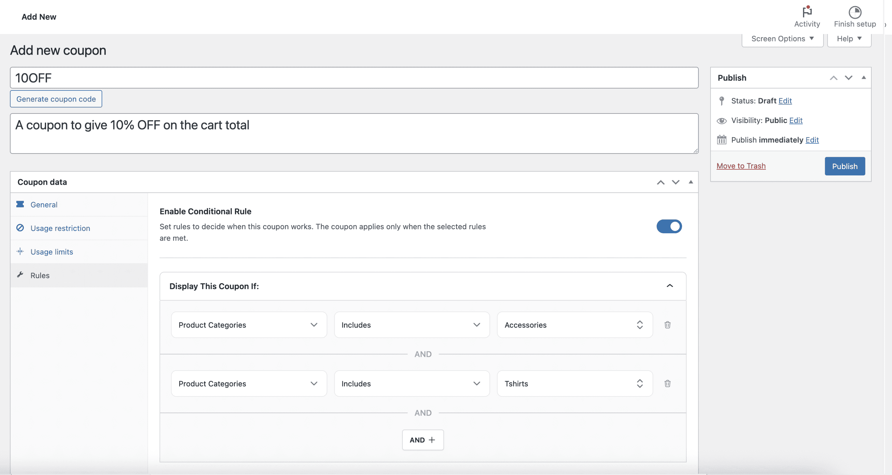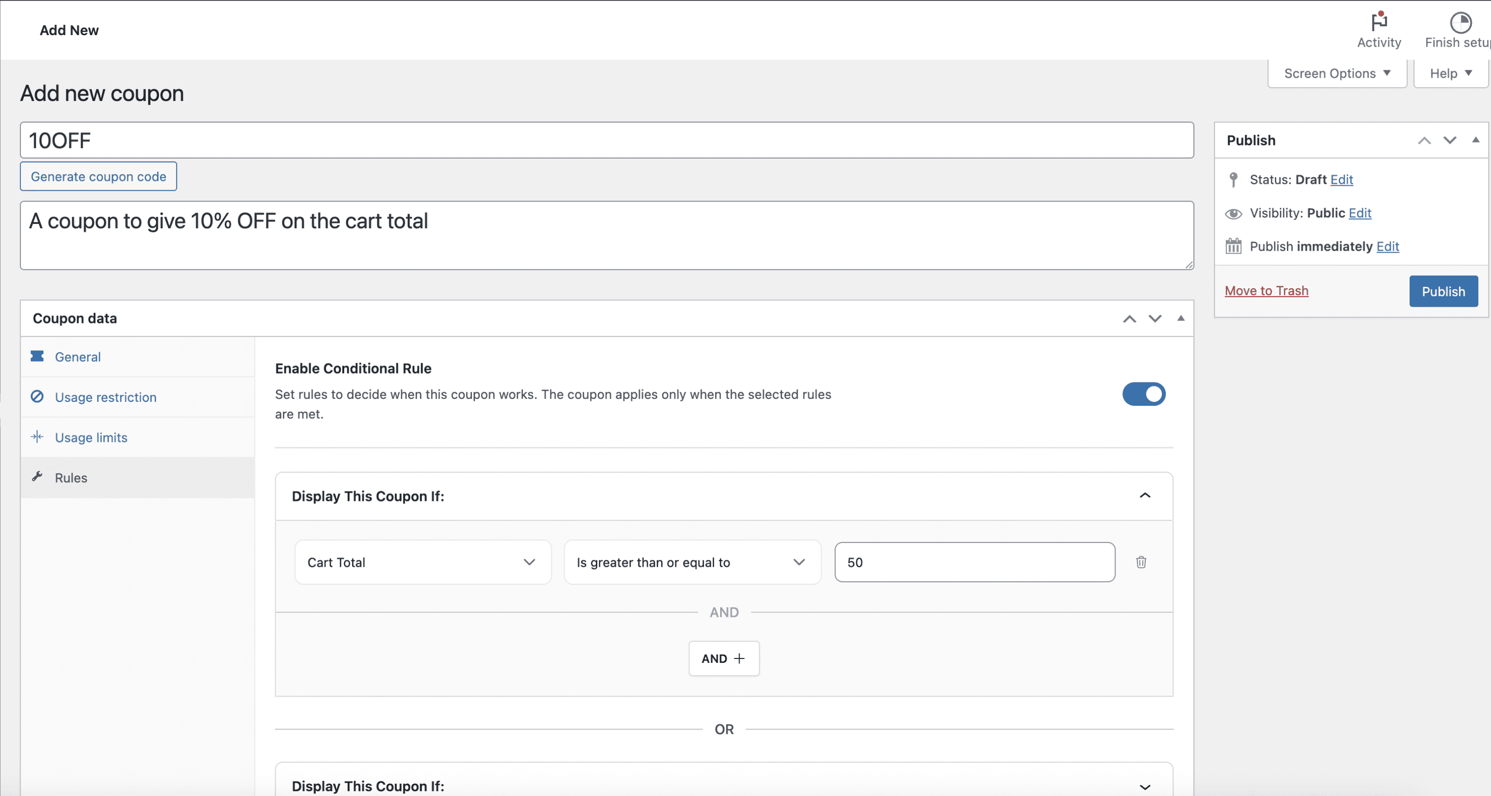 • Go to WooCommerce > Coupons and create a new rule.