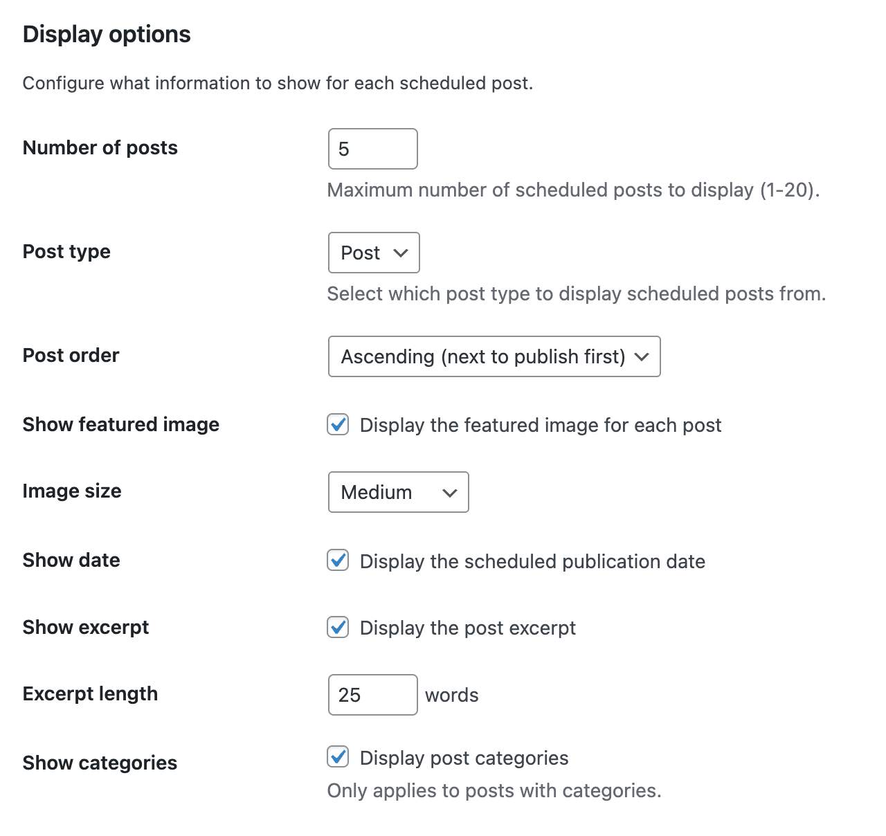 Unlike other solutions that link to scheduled posts and generate 404 errors for visitors, this plugin shows post information (title, date, excerpt, featured image, categories) without ever exposing the permalink or post ID.