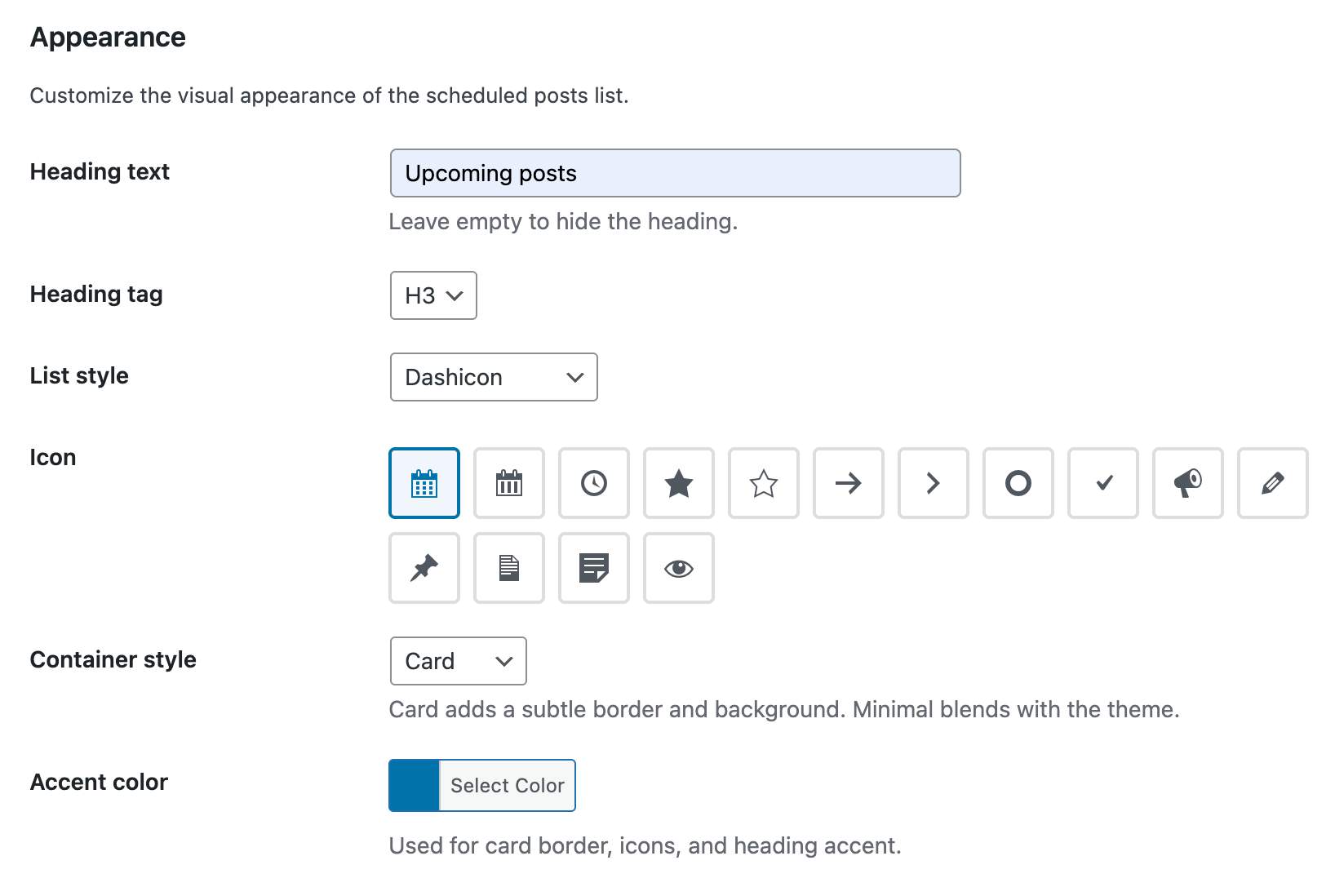 .sps-scheduled-posts– Main container.sps-style-card– Card style container.sps-style-minimal– Minimal style container.sps-scheduled-heading– Heading element.sps-scheduled-list– Posts list (ul).sps-list-dashicon– List with dashicon bullets.sps-list-theme– List with theme default bullets.sps-list-none– List with no bullets.sps-scheduled-item– Each post item (li).sps-scheduled-icon– Dashicon bullet.sps-scheduled-thumbnail– Featured image container.sps-scheduled-title– Post title.sps-scheduled-date– Scheduled date.sps-scheduled-excerpt– Post excerpt.sps-scheduled-categories– Categories list.sps-scheduled-footer– Custom footer content.sps-no-scheduled– Empty state message
