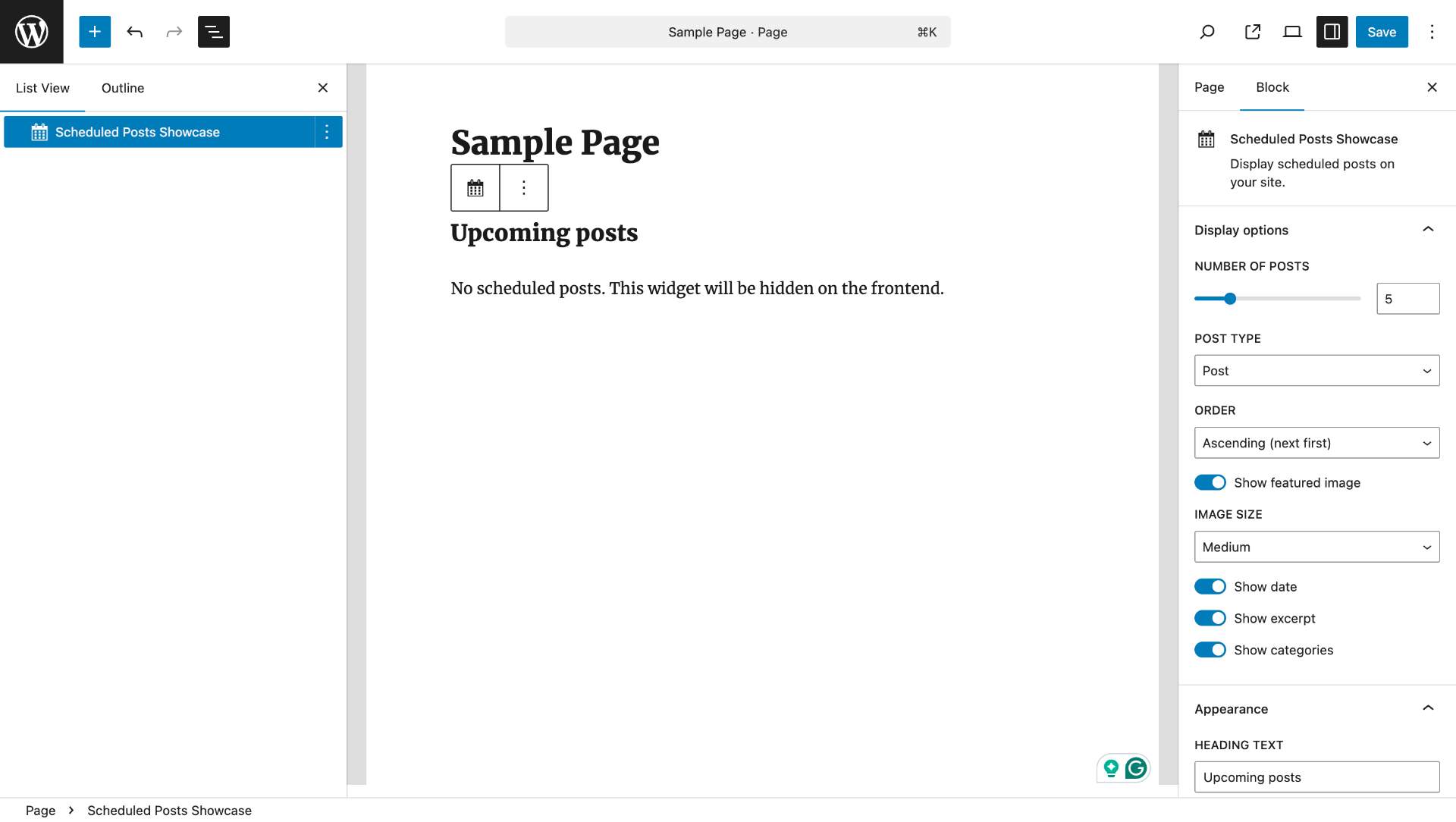- Add the widget, block, or shortcode wherever you want to display scheduled posts.