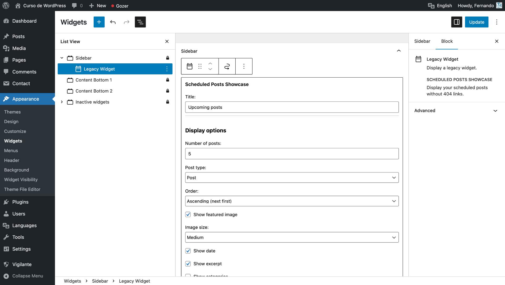 Add the “Scheduled Posts Showcase” widget to any widget area from Appearance Widgets.