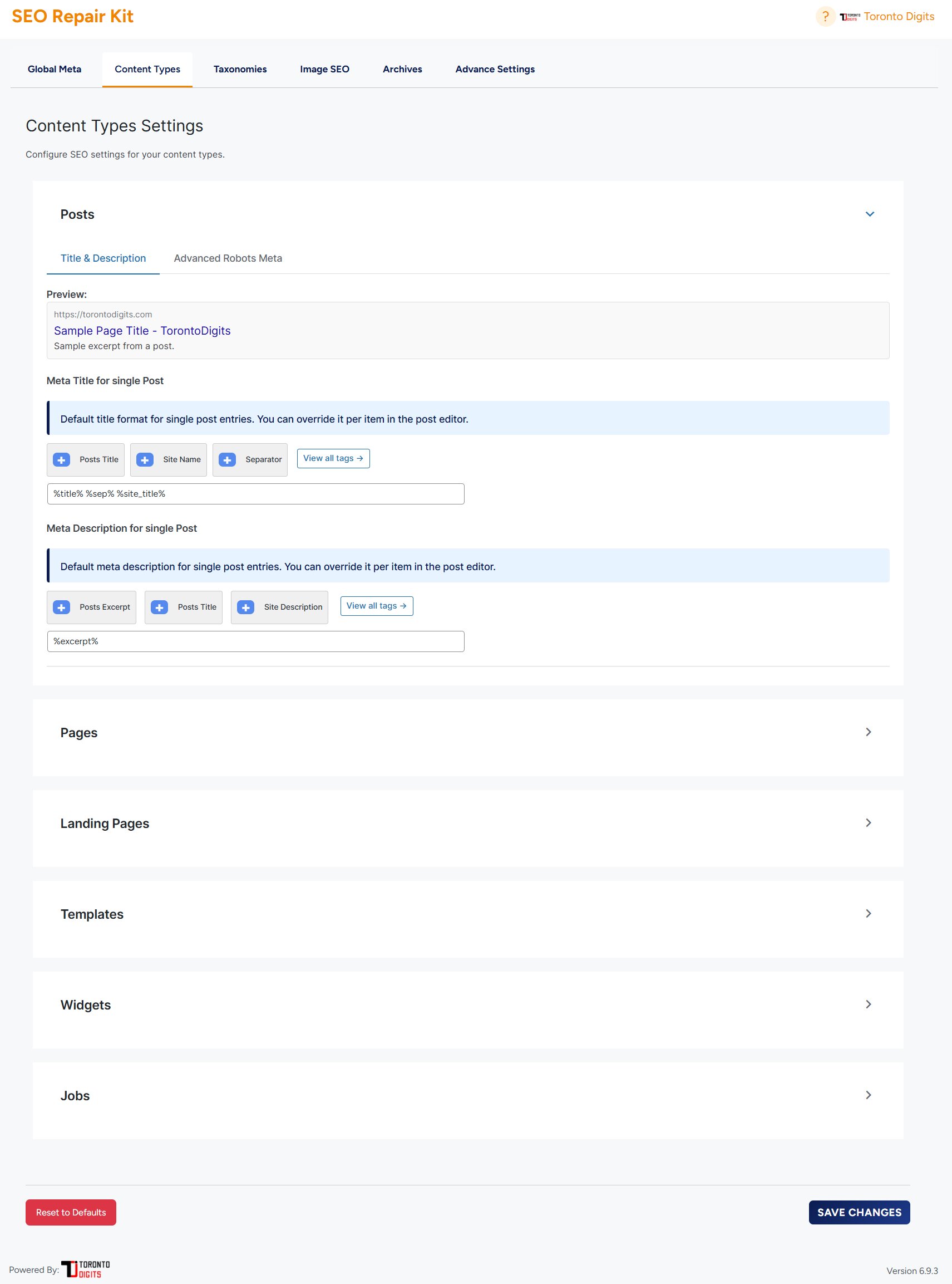 - Added Content Types SEO templates for posts, pages, and custom post types