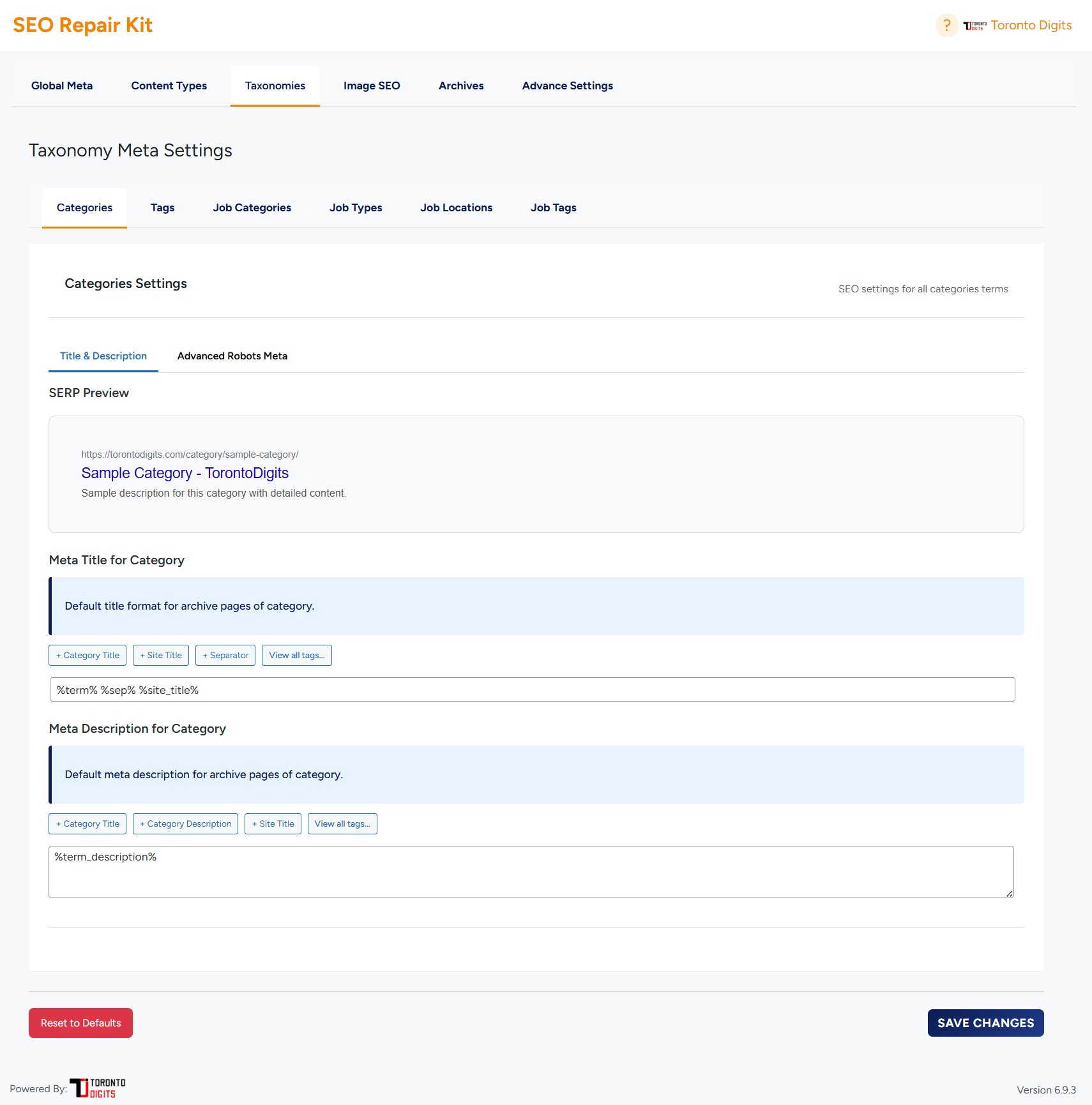- Added Taxonomies SEO templates for categories, tags, and custom taxonomies