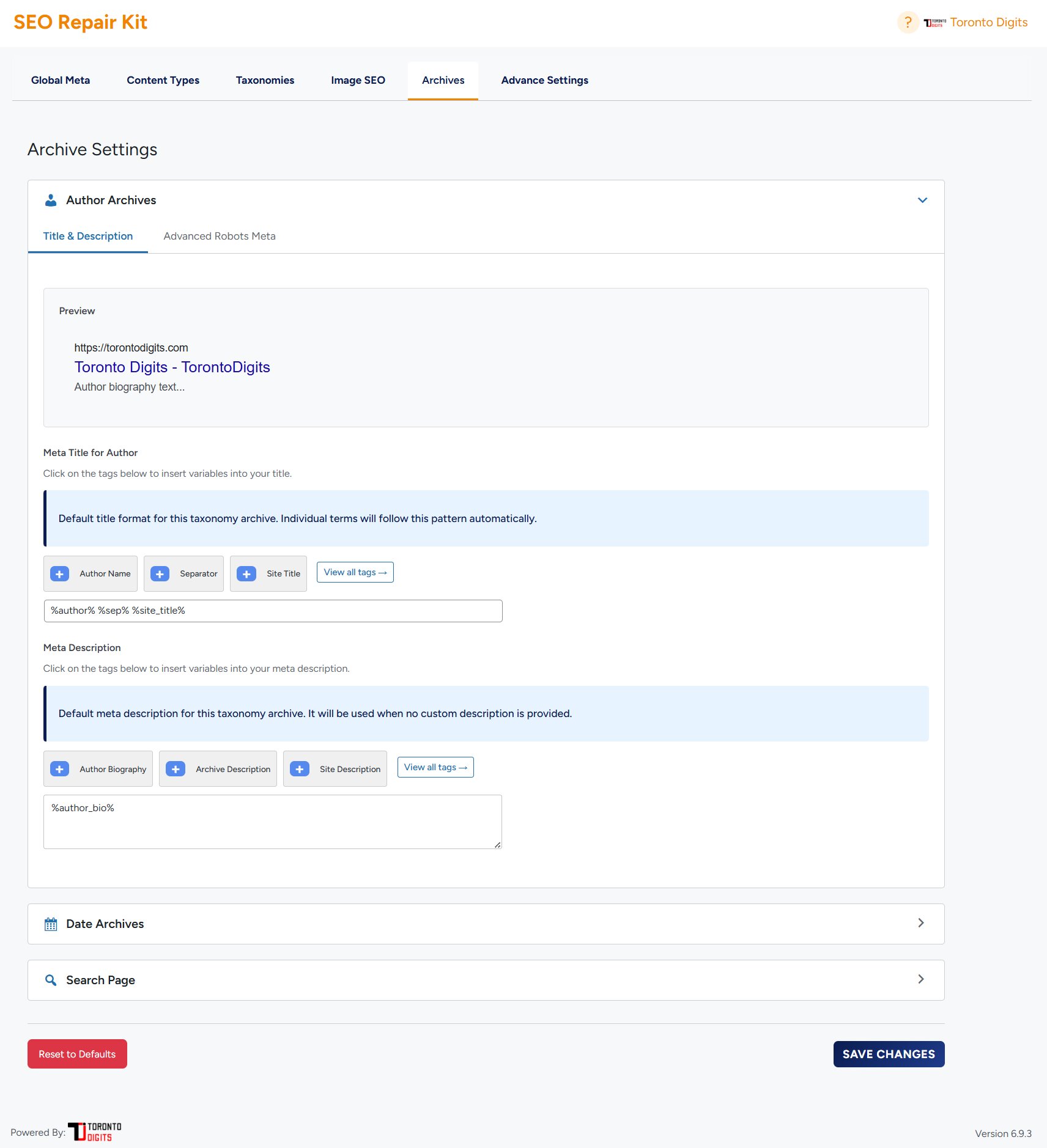 - Added Archive SEO controls for author archives, date archives, and search pages