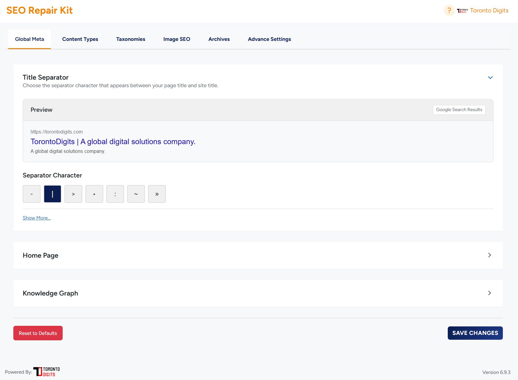 * Global Settings for title separator, homepage meta, templates, and organization data