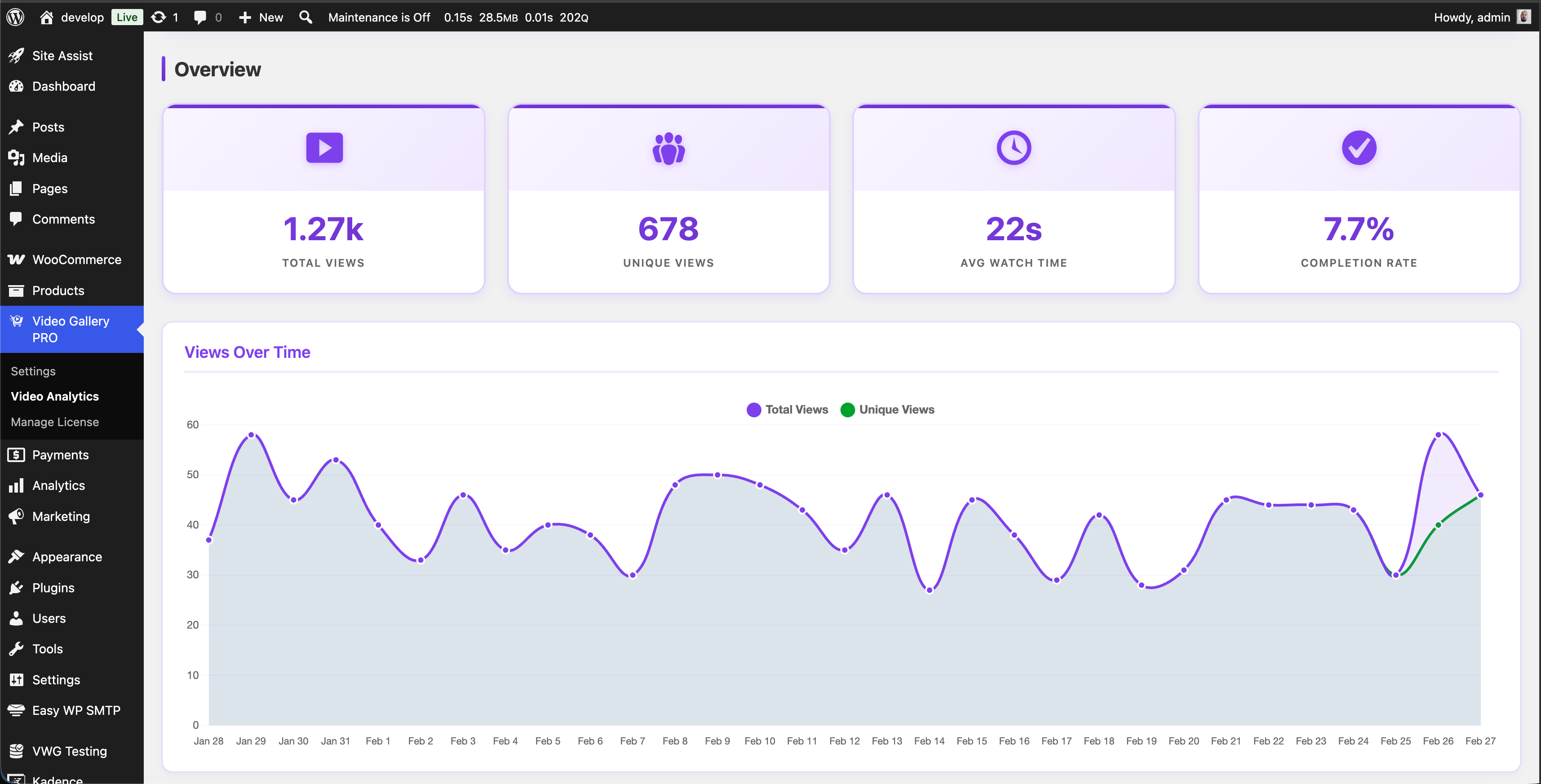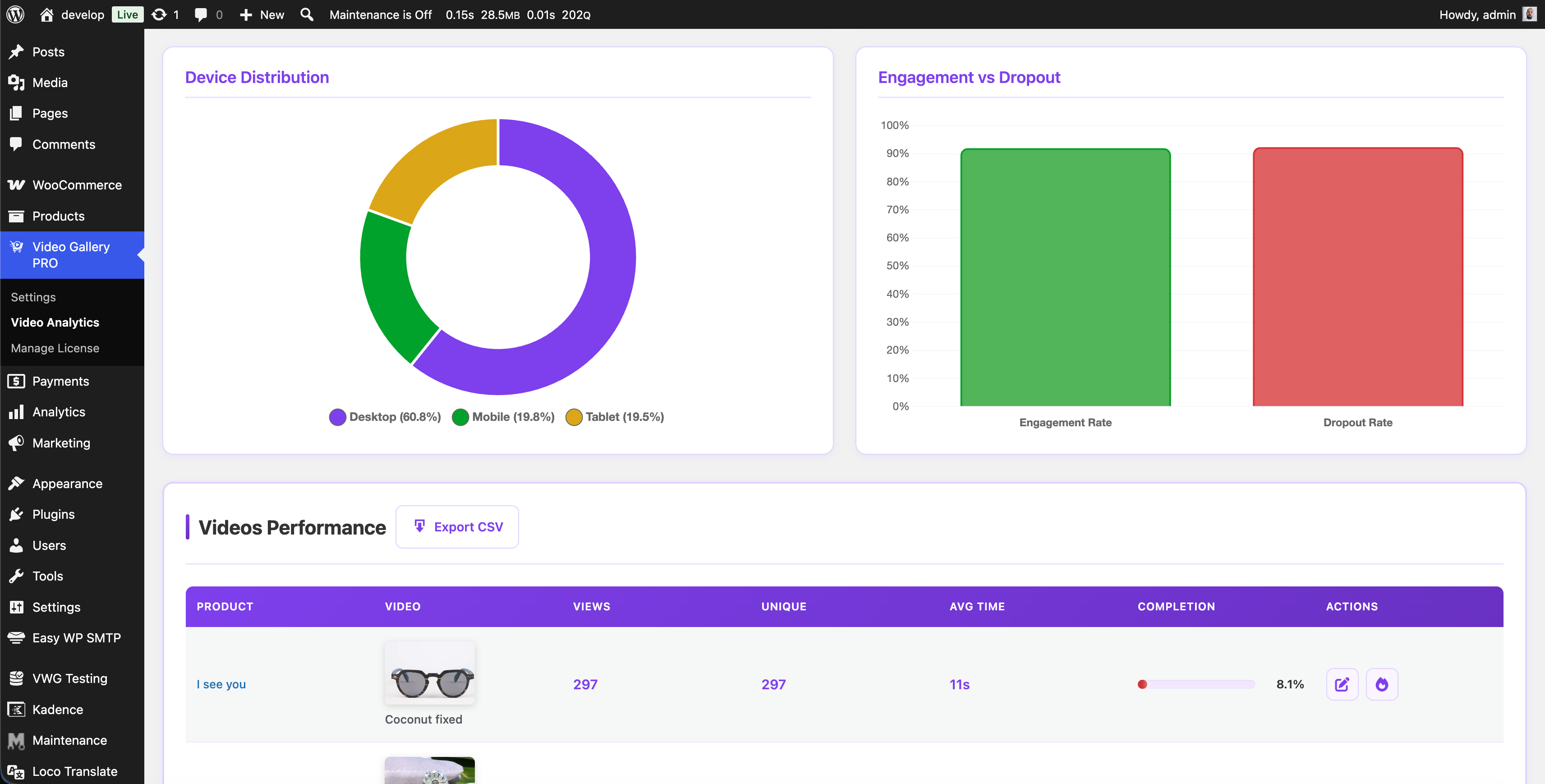 The PRO version includes a Video Analytics dashboard that tracks how visitors interact with your product videos. Enable it from Video Gallery > Settings. All PRO plans include basic analytics (views, watch time). Advanced analytics features (device charts, engagement metrics, location data, heatmap visualization, CSV export) are included in Multiple Sites and Unlimited Sites plans, or available as a one-time Advanced Analytics Add-on for Single Site license holders.